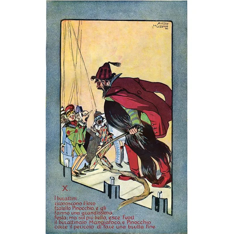 Su questo malinteso fra il burattino e l’umano occorre ragionare, perché in questione è, forse, una delle strutture nascoste – anche se senza sotterfugi – del libro. È come se l’umano potesse veramente apparire solo in ciò che umano non è: in un burattino di legno e non in un cristiano in carne e ossa. Per questo – perché veramente umano è solo l’inumano – tutti trattano Pinocchio come se fosse già il ragazzo che finirà per essere; ma per la stessa ragione, il burattino si ribella con tutte le sue forze a questa sorte del malaugurio, a questa fraudolenta metafisica. Non vuole essere un ragazzo, non vuole che si misconosca in quel modo la sua lignea e silvana natura. Si comprende allora perché quando scopre l’esistenza del Gran Teatro dei burattini, gli viene addosso la «febbre della curiosità» e, perso «ogni ritegno», vende per quattro soldi l’Abbecedario. Dopo le sue infernali peripezie nelle ostili dimore degli umani, è finalmente a casa, può verificare la sua disdetta identità.
