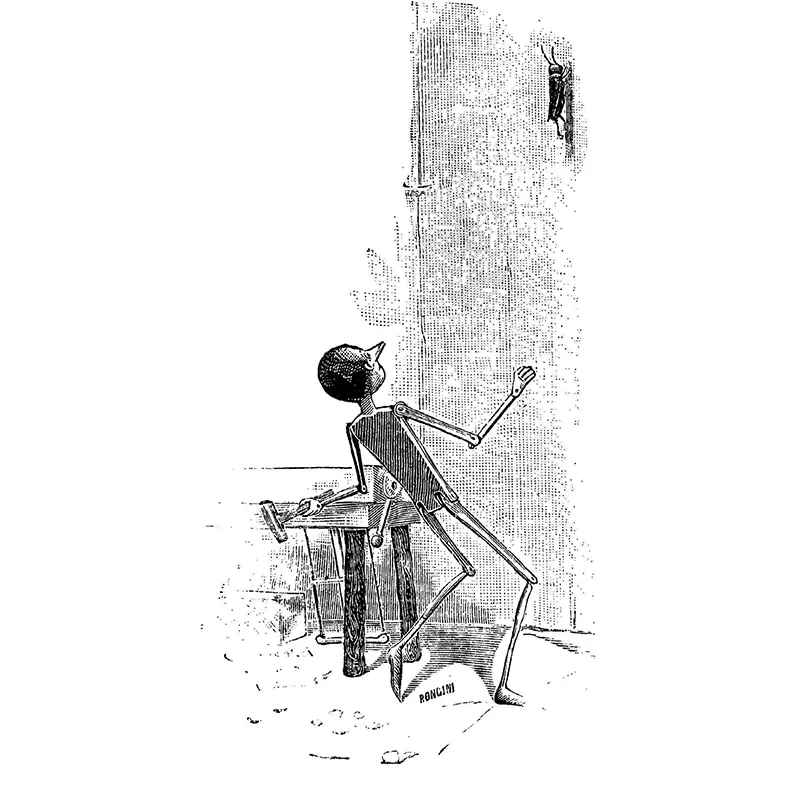 Il primo – e unico – delitto di Pinocchio – l’uccisione del Grillo-parlante scagliandogli contro un martello – è tecnicamente un crimine preterintenzionale: «Forse non credeva nemmeno di colpirlo; ma disgraziatamente lo colse per l’appunto nel capo, tanto che il povero grillo ebbe appena il fiato di fare crí-crí-crí, e poi rimase lí stecchito e appiccicato alla parete». Una disgrazia, in un certo senso, che restituisce il grillo al suo verso animale, in modo che il breve dialogo fra le due creature che secondo natura non potrebbero parlare è incastonato fra due crí-crí-crí. Se, nella fiaba, vi è scambio anche di voce e linguaggio, se l’uomo stregato ammutolisce, la natura, fatata, prende invece la parola, ma non dimentica la sua antica voce animale.