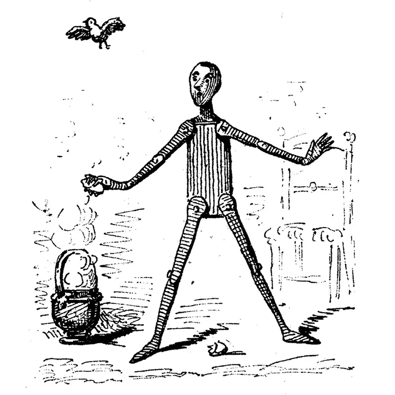Possiamo percorrere in fretta i capitoli che precedono la scoperta del Gran Teatro. La fame spinge Pinocchio ad avvicinarsi al focolare con la pentola che bolle, per accorgersi solo allora di quel che il lettore già sapeva, e, cioè, che si tratta soltanto di un trompe-l’oeil che qualcuno – forse lo stesso Geppetto, come suggerisce il chiosatore – ha dipinto sulla parete (ma Collodi non lo dice in alcun modo). Alla stranezza che una misera stamberga sia affrescata, fa riscontro la banalità del soggetto, che contrasta con i dipinti che, nelle fiabe tradotte da Collodi, raffigurano «ogni maniera di uccelli, di pesci, di animali, con gli alberi e i frutti e le piante della terra, gli scogli, le rarità e le conchiglie del mare, il sole, la luna, le stelle e i ritratti dei re e dei sovrani che regnavano nel mondo». La casa di Geppetto sarà magari «platonica», come insinua il commentatore, ma resta «una stanzina terrena» ed è di quella stanzina che Pinocchio affamato fruga ogni angolo e cassetto per cercare «un po’ di pan secco, un crosterello, un osso avanzato al cane, un po’ di polenta muffita, una lisca di pesce, un nocciolo di ciliegia, insomma qualcosa da masticare». L’uovo di gallina che trova nella spazzatura, benché nella tradizione esoterica raccolta da Bachofen, sia un simbolo misterico, mundi simulacrum e arché geneseos, principio di generazione, si rivela, come la pentola che bolle, un inganno, perché appena Pinocchio ne spezza il guscio, lascia scappar fuori «un pulcino tutto allegro e complimentoso» che, prima di volar via, gli fa una bella riverenza e lo ringrazia d’avergli risparmiato la fatica di rompere il guscio. Il secondo animale che il burattino incontra è il contrario del pedagogico grillo: lo chiama addirittura «signor Pinocchio» (ancora lo scambio con l’umano) e lo saluta cerimoniosamente: «Mille grazie, signor Pinocchio, d’avermi risparmiato la fatica di rompere il guscio! Arrivedella, stia bene e tanti saluti a casa!» Se l’uovo è davvero un’allegoria della generazione e della rigenerazione, Pinocchio riesce allora a fare come ierofante per il pulcino ciò che non può né vuole fare per sé: nascere e trasformarsi.