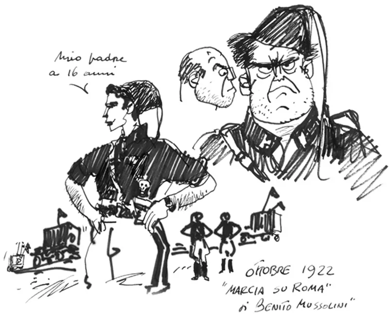 Allora mio papà , senza aver avuto questo padre dietro, deve essere venuto su con delle debolezze, con delle preoccupazioni. Così entrò dentro nella famiglia di mio nonno materno. E lì, o mangiavi questa minestra o saltavi dalla finestra: mio nonno, il callista di Venezia, era il fondatore dei Fasci di Combattimento della città . Col suocero fascista mio padre si era sempre dato da fare per tirare avanti con lavori del regime: per esempio aveva lavorato alla bonifica delle paludi Pontine e altre robe così.