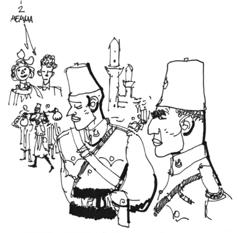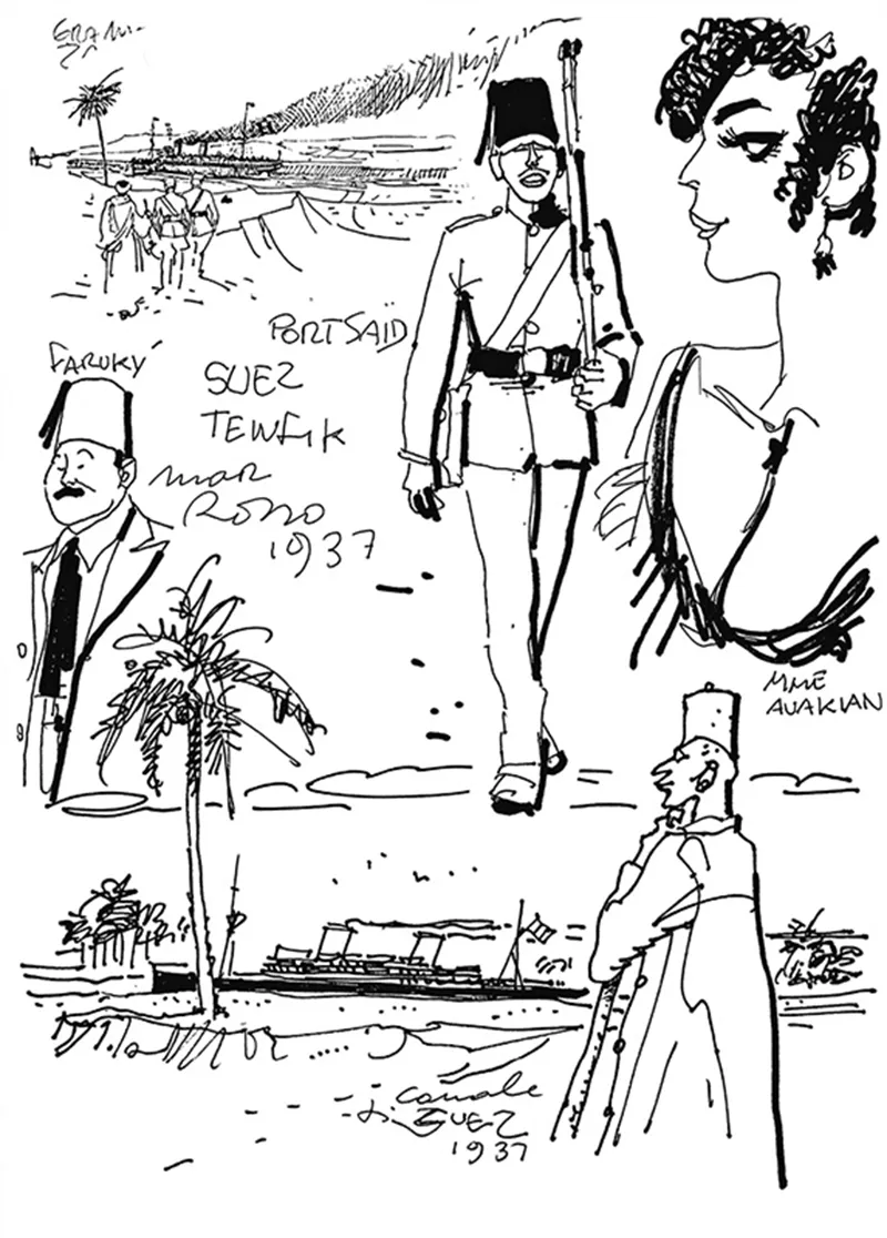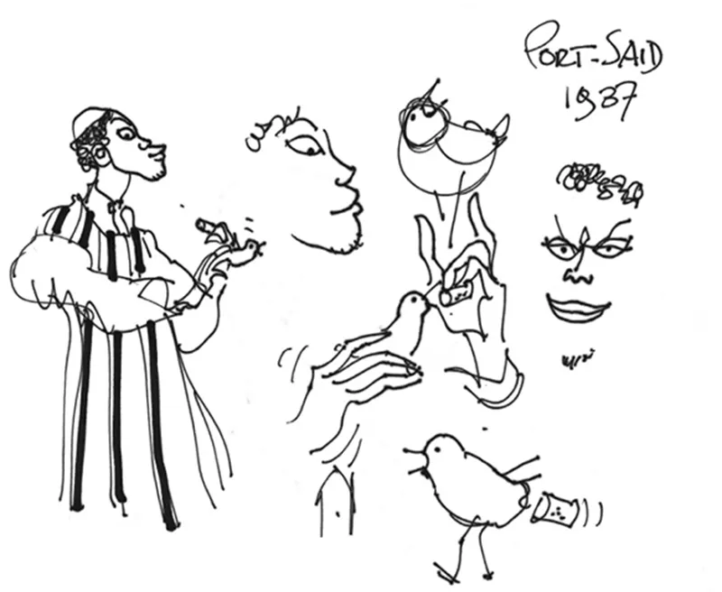 Così arrivammo a Port Said. Ricordo tante feluche in acqua. Potevamo sbarcare. Venne a bordo il console italiano. Eravamo invitati al consolato dove ci sarebbe stata una specie di manifestazione fascista, il solito discorso insomma. I fascisti si preoccupavano. La questione era questa: il fascismo di fronte all’Egitto.4 Io ero bambino e non potevo capire ancora bene tutto, però intuivo qualcosa. Vedevo tutti questi inglesi in divisa, tutti questi inglesi in borghese, questi egiziani in vestito bianco con il turchetto rosso in testa, che erano venuti a prendere il nostro ufficiale con la faccia cotta sopra una macchina particolare. Poche parole, saluti freddi, tutto chiaro, monta su e via. I fascisti invece urlavano molto, facevano tutti questi gesti, questi cenni.