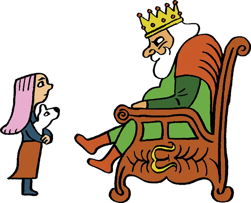 La signorina dai capelli rosa ascoltò le domande, poi rimase in silenzio qualche secondo, guardò negli occhi il cagnetto e, dopo aver sospirato profondamente, partì a passo spedito verso la casa del re.