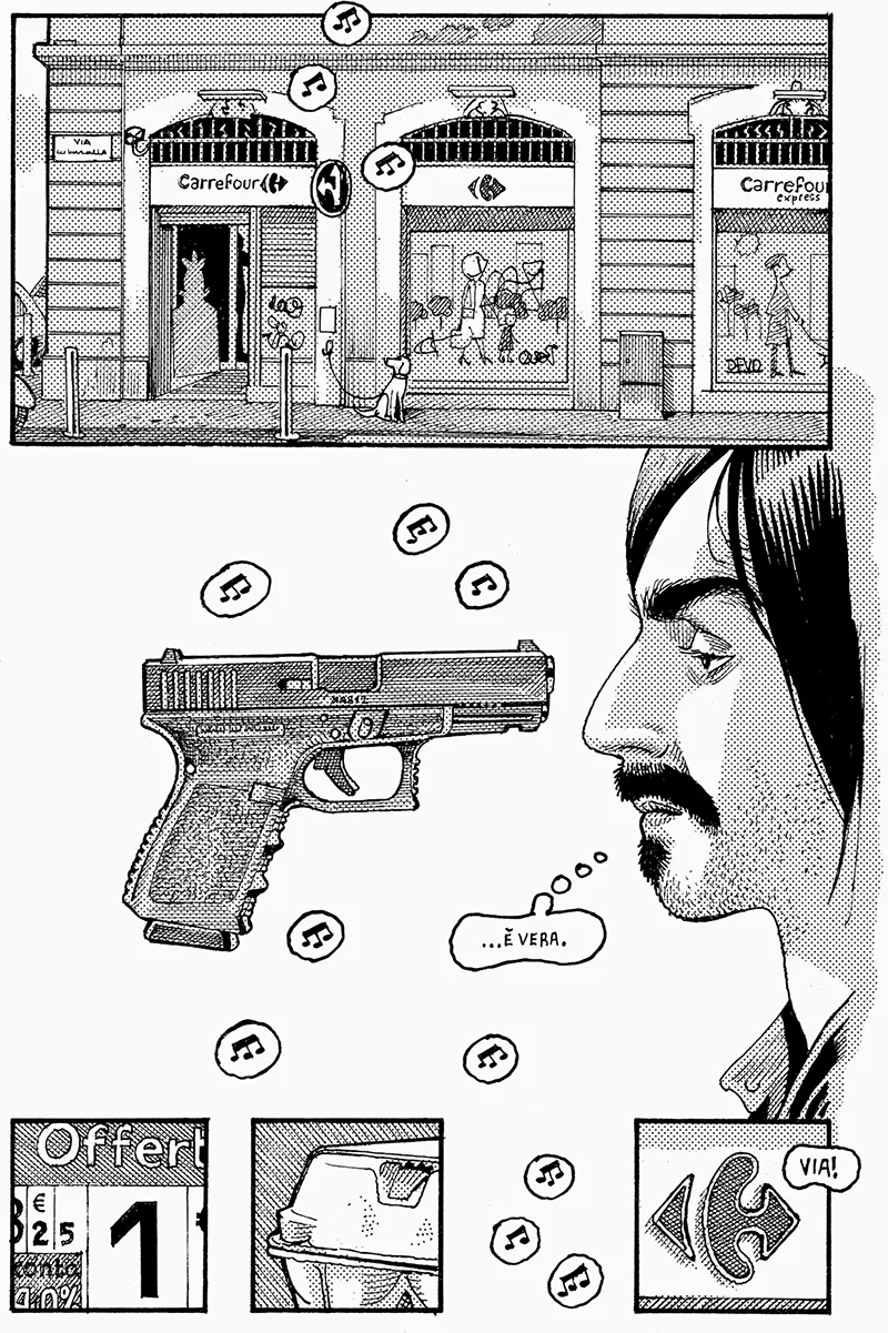 Avrebbe dovuto rimanersene a casa, il Ragazzo, ad aiutare Emanuela a occuparsi del bimbo. E invece a volte ci si impunta senza neanche sapere bene il perché e con una scusa qualsiasi si esce dal guscio protettivo delle Case e ci si avventura nel mondo. “Ma che avventura e avventura” pensa il Ragazzo. Comprare delle uova, di quello si tratta, seguendo una pista battuta: un corridoio di cinquanta metri che collega il portone del suo palazzo col Carrefour dall’altro lato del marciapiede. Trenta secondi per attraversare la strada, alzare gli occhi al cielo e vedere il sole tramontare dietro le Alpi in via Farini. Cinquanta secondi per trovare le uova in mezzo agli scaffali e presentarsi alla cassa, primi, senza neanche dover fare la coda, a quest’ora del mercoledì. Dieci secondi per appoggiare le uova sul nastro trasportatore, fare il gesto di infilare la mano dentro la borsa per prendere il portafoglio e voltare la testa di scatto verso le porte automatiche. Due tizi col passamontagna e il bomber entrano in scena formulando la battuta classica: «Fermi tutti, questa è una rapina!»