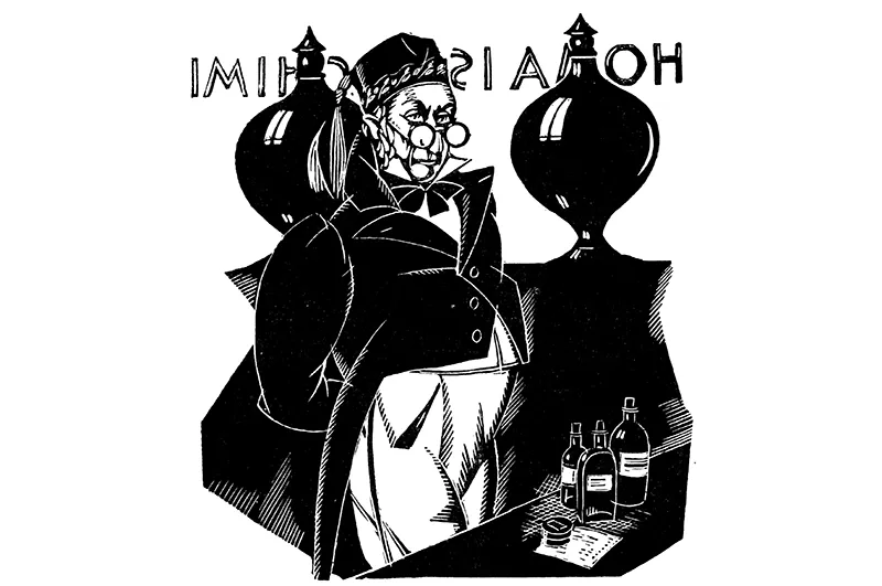 Ma ciò che più attira lo sguardo, è la farmacia del signor Homais, di fronte all’albergo del Lion d’or. La sera, quando la lampada della farmacia è accesa, i boccali rossi e verdi che abbelliscono la vetrina allungano lontano, sul terreno, i loro bagliori colorati, e attraverso di essi, come in mezzo a fuochi di bengala, si intravede l’ombra del farmacista appoggiata al suo leggio. La facciata della casa è coperta, dall’alto in basso, da iscrizioni in corsivo, in rotondo, in stampatello: “Acqua di Vichy, di Seltz e di Barèges, sciroppi depurativi, rimedio Raspail, racahout arabo, pastiglie Darcet, pasta Regnault, bende, bagni, cioccolata purgativa, ecc.”. E l’insegna, lunga quanto tutto il negozio, porta scritto in lettere dorate: Homais, farmacista. Poi, in fondo alla bottega, dietro la grande bilancia fissata sul banco, si legge la parola laboratorio al di sopra di una porta a vetri dove, a metà altezza, è ripetuto ancora una volta Homais in lettere dorate su fondo nero.