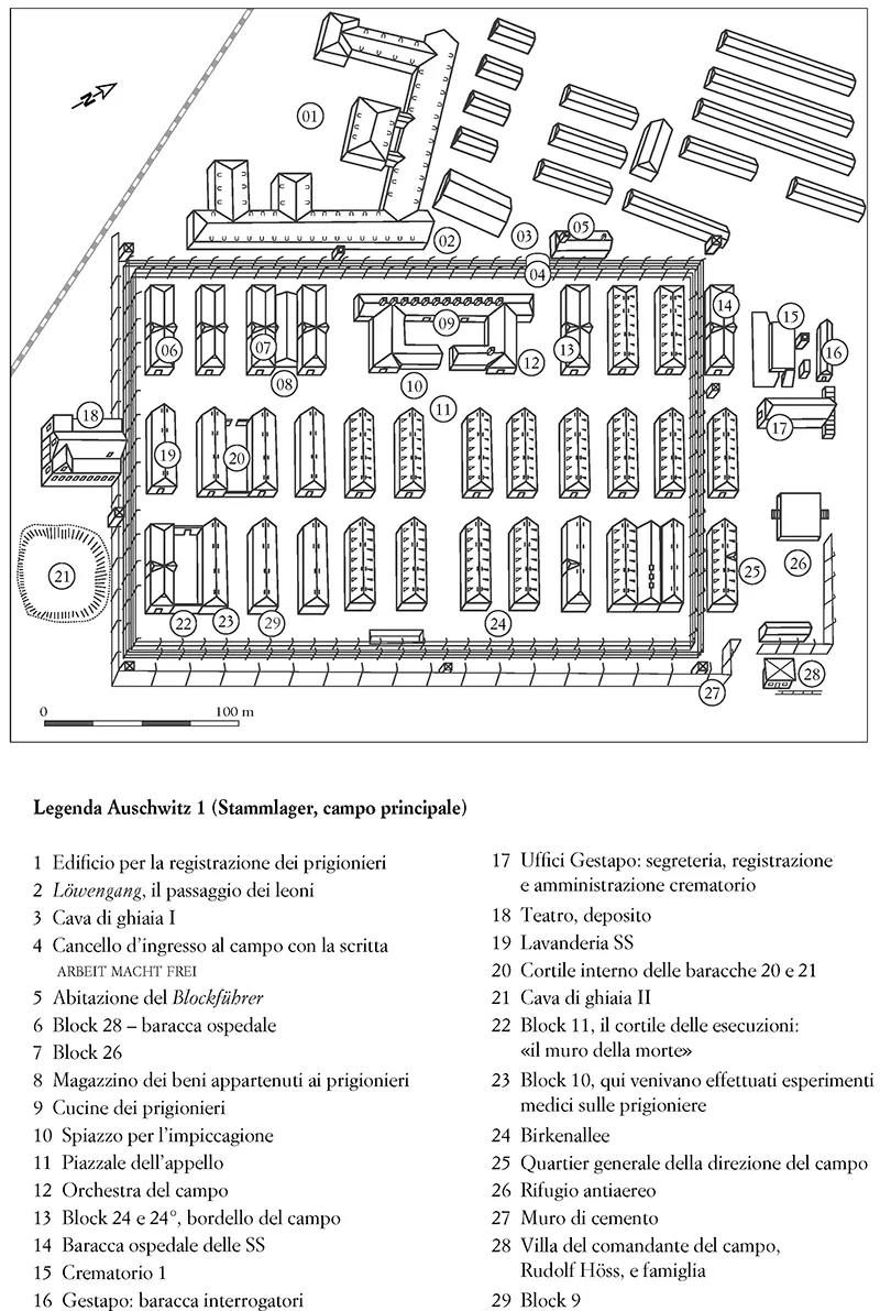 Alle prime luci dell’alba il convoglio si rimise in moto un’ultima volta e dopo pochi minuti si fermò su una massicciata, in mezzo al paesaggio pianeggiante. Lungo i binari c’erano gruppi di dieci, dodici uomini. Indossavano berretti e divise a strisce bianche e azzurre. Molte SS camminavano avanti e indietro prese da un’incomprensibile operosità.