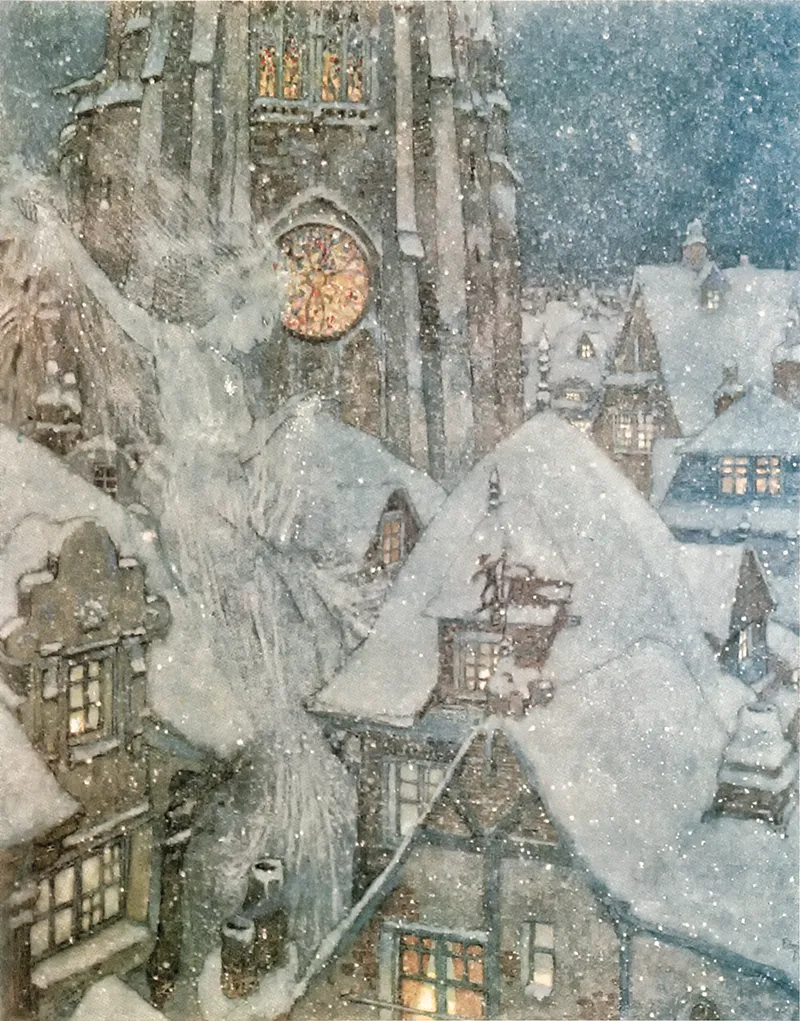 Quella sera il bambino, dopo essersi vestito per la notte, si arrampicò sullo sgabello e guardò fuori attraverso lo spioncino. Alcuni fiocchi di neve volteggiavano pigramente nell’aria, e il più grosso andò a finire proprio sul bordo di una delle casse di fiori. E una volta caduto iniziò a crescere di dimensione, sempre più grande, sempre più grande… e alla fine prese l’aspetto di una donna alta e snella, vestita di un velo bianco tessuto con cristalli di neve. Era bella e delicata, anche se era tutta di ghiaccio abbagliante: ma non c’era dubbio che fosse viva, e i suoi occhi brillavano come due stelle nel cielo terso. Fece un cenno verso la finestra e sollevò una mano come per salutare, ma nel suo sguardo non c’era calma né serenità. Kay si spaventò e si gettò giù dallo sgabello, e subito ebbe la sensazione che l’ombra di un grande uccello fosse appena passata davanti alla finestra.