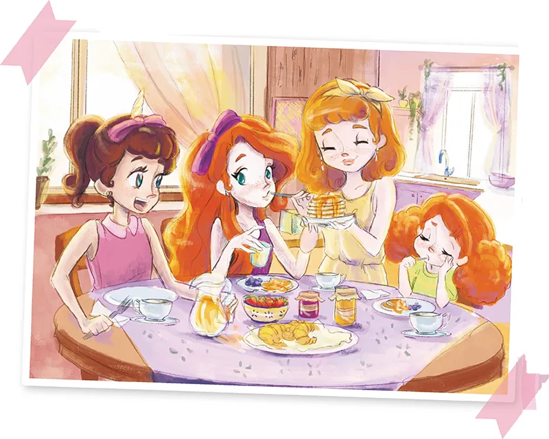 Giulia era di due anni più piccola di Glitter ed era un tornado. Irruppe in cucina come se avesse raggiunto il traguardo di una vera gara, si sedette a tavola e addentò in un solo boccone quattro pancakes, sporcandosi tutto il mento di panna e pezzetti di fragola. La mamma allungò la colazione anche a Glitter e diede a entrambe un bacino sulla punta del naso, com’era solita fare per augurare loro il buongiorno. Poi si mise a preparare una terza porzione di pancakes per Candy, che doveva arrivare da un momento all’altro.