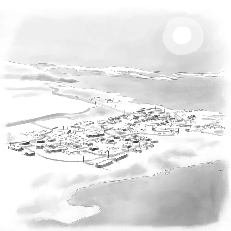 Le circa duecento case di Kugaaruk sono incastonate tra due specchi d’acqua spettacolari: un kuuk (“fiume”), così limpido che ci si può chinare a bere dal suo corso ogni volta che si ha sete, e una baia di un colore tra il blu e il grigio, che risplende di increspature nel sole basso dell’estate. Diverse isole punteggiano la baia, simili a spalle di giganti verdi intenti a pescare.
