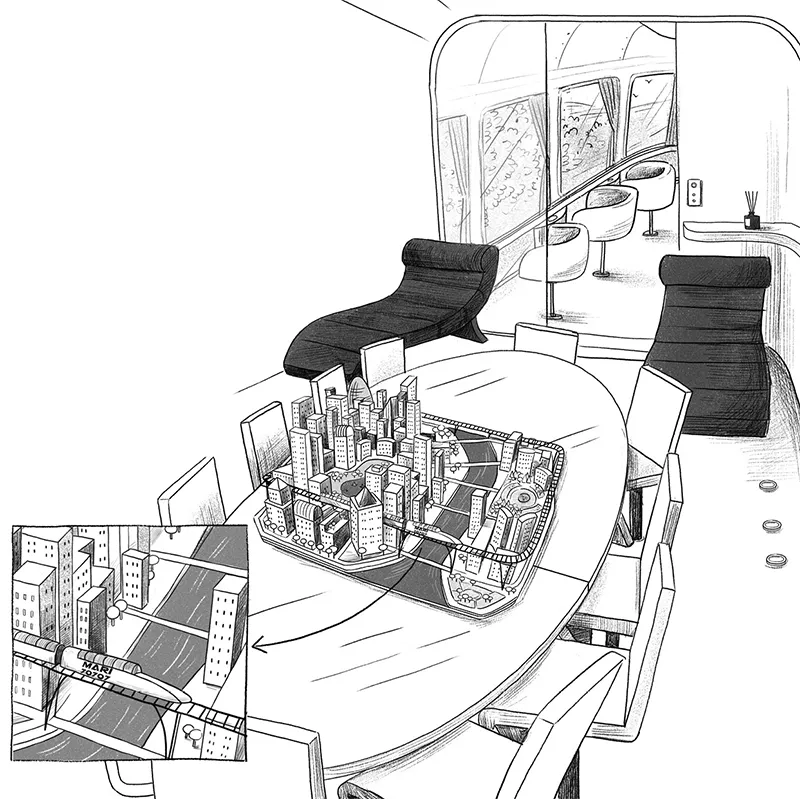 Hal sgranò gli occhi. All’interno del tavolo c’era il plastico perfetto di una città , che si sollevò mentre il tavolo sotto si ripiegava. Tra minuscoli grattacieli e parchi curati, un affusolato treno color argento dal muso aerodinamico, simile a quello di un razzo, sfrecciava su una ferrovia sopraelevata. Su un lato della locomotiva, sotto la parola Mari, c’era il numero 70707.
