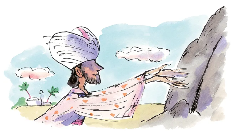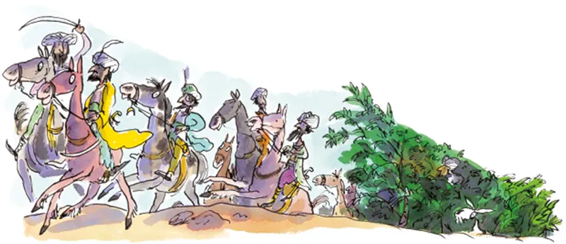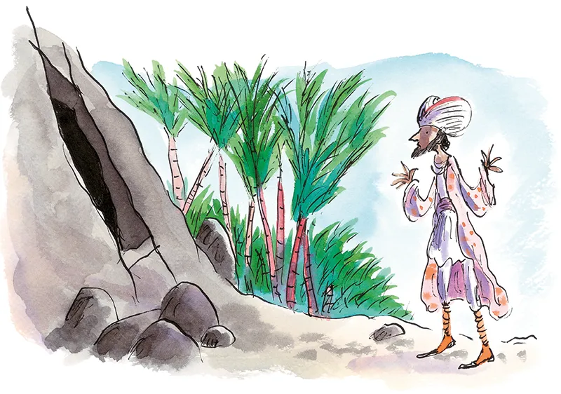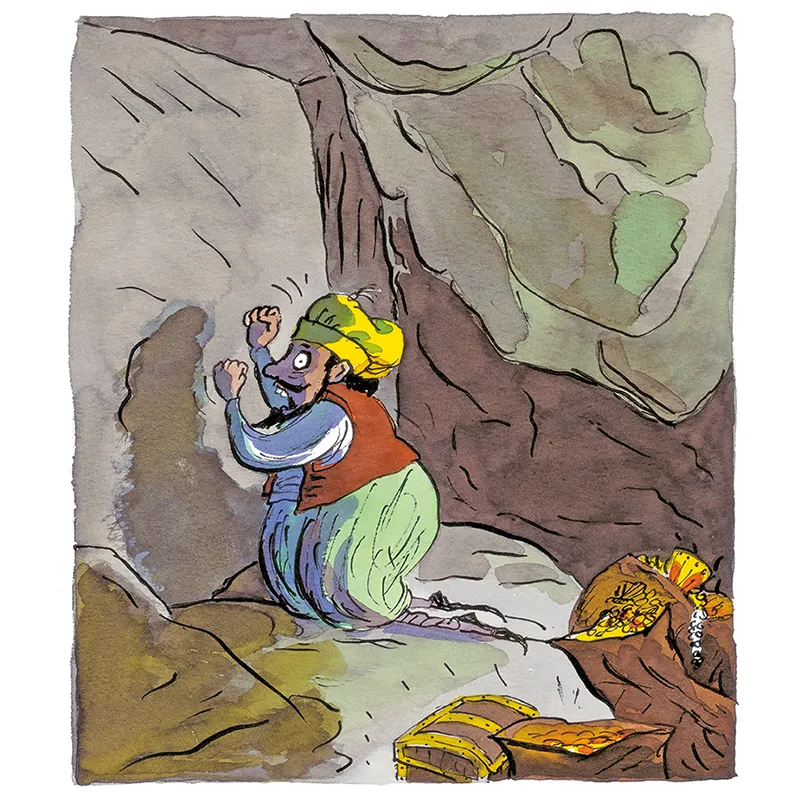 Disperato, Kassim picchiò i pugni sulla roccia e all’improvviso vide la porta spalancarsi. Ma il sollievo svanì in fretta, perché fuori, ad aspettarlo, c’erano i quaranta ladroni, e non avevano un’espressione rassicurante. Il capo sfoderò la spada – era una scimitarra enorme, curva e affilata – e si fece avanti, spingendo Kassim dentro la grotta. L’uomo inciampò e cadde.