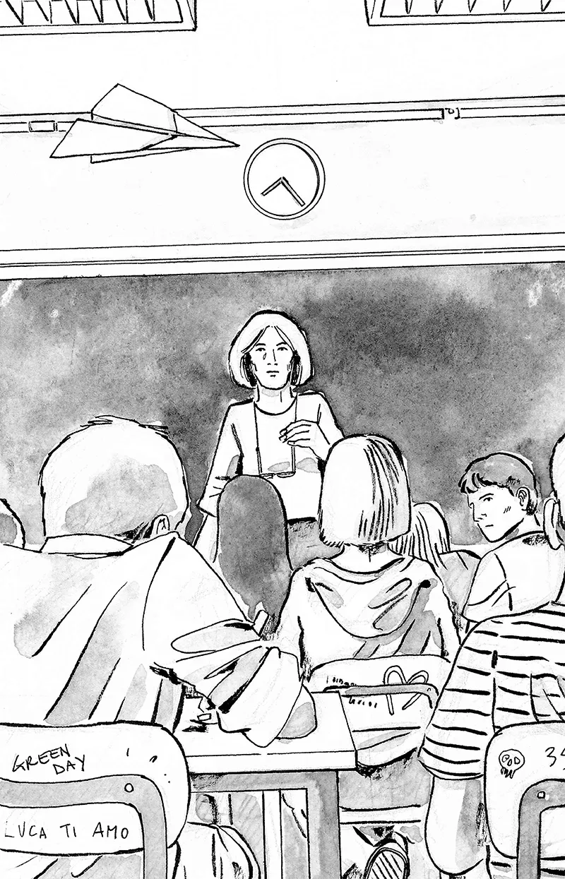 Era già troppo, onestamente. Un carico pesante. E gli altri la pensavano come me: Luca temperava una matita già temperata, Pietro grattava il banco con il pollice, forse nel tentativo di staccare un pezzo di colla secca.