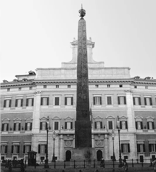 Roma contemporanea deve ad Augusto un tratto caratteristico del suo paesaggio, un’impronta antica destinata a moltiplicarsi nei secoli e a diventare un segno inconfondibile, uno stile. Egli fu il primo a far trasferire nella capitale due obelischi egiziani6. Il primo, quello di Ramses II prelevato a Heliopolis, fu posto lungo la spina del Circo Massimo e si trova oggi al centro di piazza del Popolo; il secondo, appartenente a Psammetico II, fu usato come gnomone dell’orologio monumentale fatto costruire da Augusto nel Campo Marzio, e si trova ora in piazza Montecitorio (fig. 2). La scelta aveva due motivazioni intrecciate, una politica, l’altra estetica: quegli obelischi potevano essere considerati un bottino di guerra, e ricordavano che Augusto aveva sconfitto Cleopatra e annesso l’Egitto al dominio romano; al tempo stesso essi appagavano una moda egittizzante che si andava affermando a Roma da alcuni decenni a partire dall’ambito religioso, soprattutto in seguito alla diffusione del culto isiaco. Il duce volle anche lui il suo obelisco e fece trasportare a Roma il gigantesco obelisco di Axum (24 metri di altezza e 10 tonnellate di peso) che fu collocato davanti al palazzo del ministero dell’Africa italiana, poi diventato sede della Fao (fig. 3). A differenza degli obelischi egiziani, che si erano inseriti armoniosamente nei contesti monumentali della Roma antica, rinascimentale e barocca, quello di Axum non ha mai trovato una sua nuova vita nel paesaggio della capitale ed è servito per alcuni decenni ad adornare una rotonda spartitraffico. Nel 2005 il governo italiano ha restituito il monumento all’Etiopia, contribuendo al suo restauro e alla sua collocazione nel sito originario.