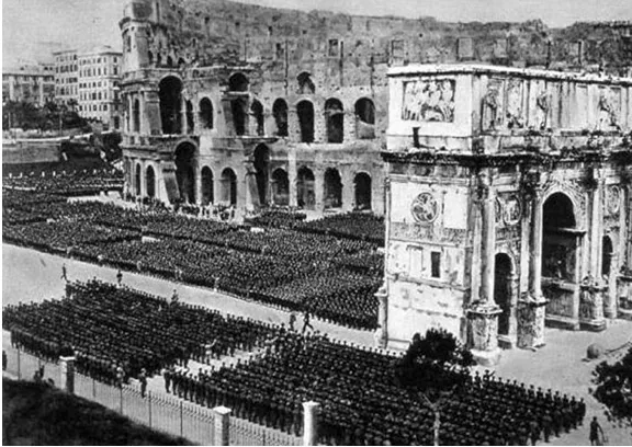 Fig. 6. Roma, parata militare delle «giovani generazioni fasciste» tra l’Arco di Costantino e il Colosseo.