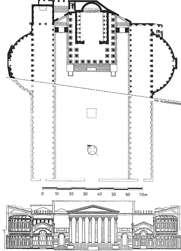 Fig. 5. Il Foro di Augusto. Pianta e ricostruzione prospettica da sud.
