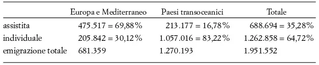 Da queste già emerge una netta discrepanza tra l’area europea, a prevalente emigrazione assistita, e i paesi transoceanici dove domina l’emigrazione individuale. E va sottolineato il notevole scarto percentuale (34,91%) tra la prima e i secondi.