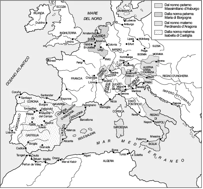 All’inizio del XVI secolo un solo sovrano, Carlo d’Asburgo, riunisce sotto il proprio scettro un enorme e straordinario insieme di possedimenti. Dal padre Filippo, detto il Bello, egli ha ereditato i tradizionali domini della casa d’Asburgo, concentrati nell’attuale Austria, e l’eredità borgognona della nonna, formata dalla Franca Contea e dai Paesi Bassi. Dalla madre, Giovanna, detta la Pazza, Carlo ha ricevuto le corone di Castiglia e di Aragona, che includono i regni di Sardegna, Sicilia e Napoli, nonché le nuove colonie americane. Per giunta, nel 1519, Carlo succede al nonno Massimiliano I d’Asburgo nel titolo elettivo di imperatore del Sacro romano impero della nazione germanica. In pratica, nelle sue mani si concentra il governo di un grande ed eterogeneo conglomerato di territori di cui è il naturale sovrano. Inoltre, in teoria, nella sua qualità di imperatore, Carlo V controlla indirettamente gran parte dell’attuale Germania e la Boemia, suddivise in principati, vescovati e città indipendenti, che pur sostanzialmente autonomi, riconoscono, almeno teoricamente, l’alta sovranità dell’imperatore, cui spetta una sorta di potere di indirizzo e di coordinamento all’interno dell’impero. Per un momento, nella prima metà del Cinquecento, un sogno (o, a seconda dei punti di vista, un incubo) sembra materializzarsi, quello della restauratio imperii, la rinascita dell’impero.