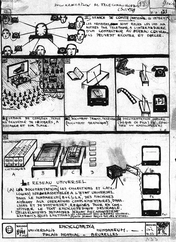 Sin qui la storia, veniamo alla teoria. Poco alla volta, il visitatore coglie un’aria di famiglia in quelle carte d’altri tempi, e a un certo punto si fa avanti l’illuminazione: il sogno di Otlet e La Fontaine si è realizzato da un po’ di anni, ed è il web. E, inversamente, nei due belgi che avrebbero potuto darsi il motto di Monsieur Teste, «transit classificando», troviamo, per così dire, l’anello di congiunzione tra le enciclopedie e le biblioteche, e quell’immenso catalogo sans papier che è per l’appunto fornito oggi da internet. Otlet sognava il giorno in cui tutti avrebbero potuto accedere a questo immane archivio standosene a casa, come nella illustrazione di suo pugno riportata all’inizio del capitolo2: libri, cataloghi e documenti sarebbero stati accessibili alla televisione, che negli anni Trenta muoveva i primi passi. In questa visione, in effetti, il Mundaneum diventa un Panopticon, il carcere ideale progettato alla fine del Settecento da Jeremy Bentham, e valorizzato filosoficamente da Foucault nel secolo scorso3. Ma si tratta di un Panopticon capovolto: non una torre che spia tutti, bensì dei televisori da cui tutti possono vedere, appunto come internet, o quasi.
