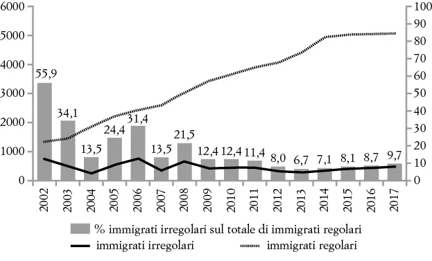 Fig. 1. L’immigrazione irregolare in Italia rispetto ai soggiornanti regolari, 2002-2017. Valori assoluti in migliaia e percentuali.