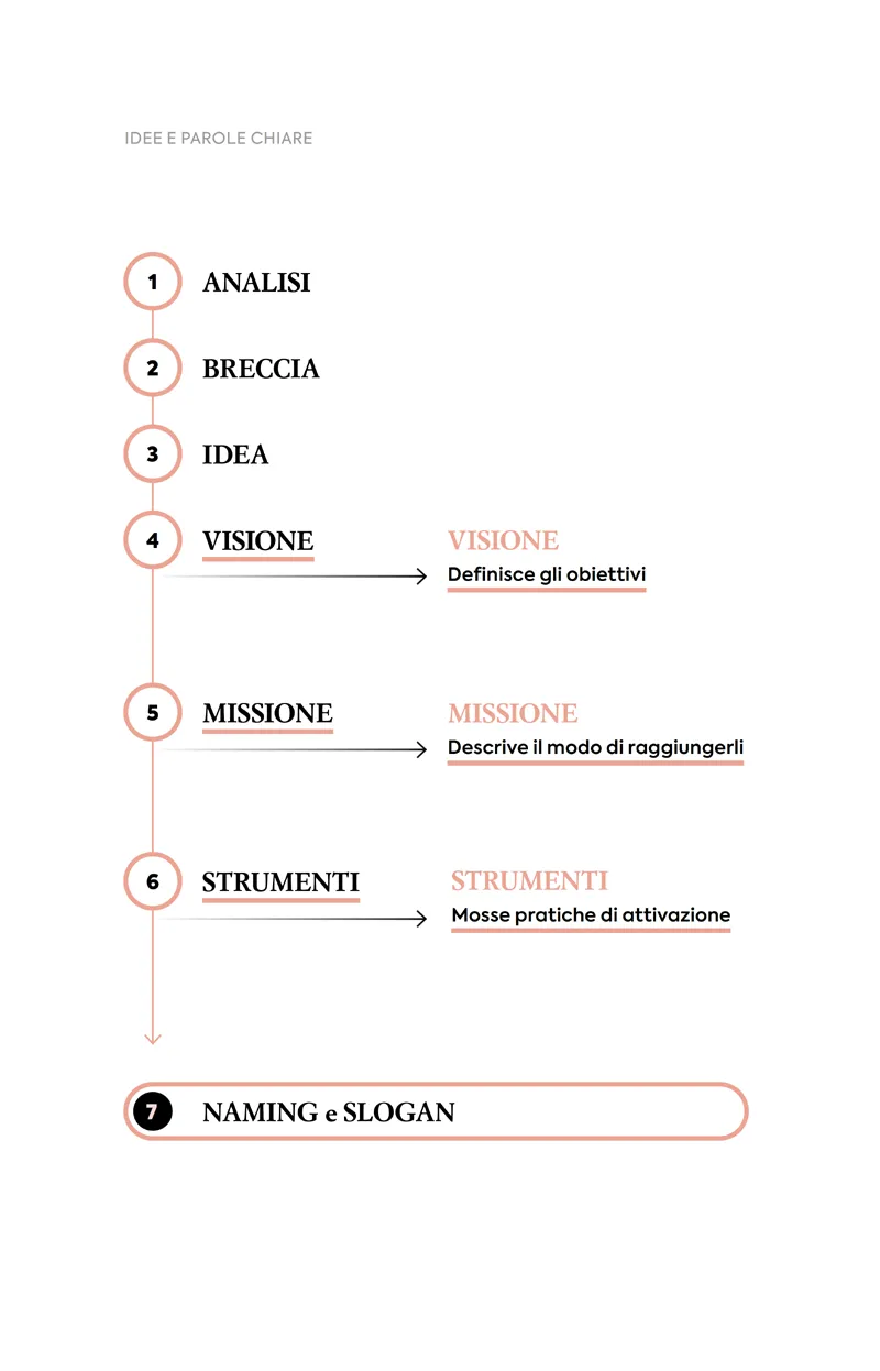 A questo punto riprendiamo in mano tutte le fasi della creazione di un’attività . Sono, come dicevo, sette: analisi, individuazione della breccia, idea, visione, missione, strumenti, naming e slogan. Dobbiamo scriverle. È l’unico modo per capire se abbiamo le idee chiare. Perché la scrittura è semplificazione, è comunicazione, è il principale strumento di connessione. La scrittura si può leggere e rileggere, si può nel tempo modificare, la scrittura rimane. La scrittura è la spina dorsale dell’esistenza di un’attività , perché la descrive, le dà vita, la fa diventare una cosa vera e soprattutto, se è chiara, netta, comprensibile, emozionante, memorabile, ebbene, ne decreta il successo.
