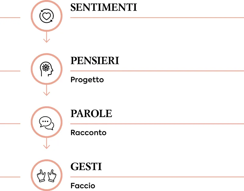 All’inizio visione, missione e strumenti, come pure le altre fasi che precedono e seguono, sono sentimenti e pensieri. Questi non sono costituiti da parole. Diciamo che da quando le abbiamo inventate, le parole, le usiamo anche per pensare (anche se mi sono reso conto che non si tratta di un metodo universale), tuttavia non ne rappresentano un elemento costitutivo. Difficile spiegare cosa siano sentimenti e pensieri. Azzardo: sinapsi, cioè incontri di neuroni. Per le parole è più facile perché sono composte da lettere (o suoni), e accompagnate da punteggiatura (o pause), cioè da segni o effetti acustici che ci siamo inventati per comunicare il nostro pensiero. Diciamo dunque che le parole sono fondamentali perché costituiscono l’anello strutturale che lega i pensieri ai gesti, in modo tale che quel gesto sia percepito come attività coerente al proprio pensiero. Sto parlando di fatti, azioni, prodotti, servizi che possono essere recepiti in modi anche molto diversi a seconda di come li accompagniamo con le parole. Posso strattonare una persona per fargli del male oppure del bene. Lui lo capisce dalle mie parole. Posso descrivere un fatto per pura cronaca oppure perché serva d’esempio, dipende da come lo dico o lo scrivo.
