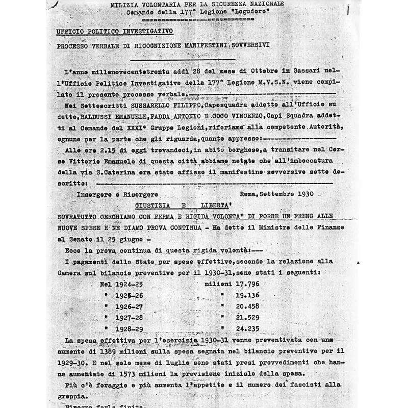Ma in quel 1930 Berlinguer è, incredibilmente, protagonista di un altro episodio “politico”, che possiamo ricostruire grazie a un verbale della 177a Legione della Milizia Volontaria per la Sicurezza Nazionale datato 28 ottobre: «Alle ore 2.15 di oggi trovandoci, in abito borghese, a transitare nel Corso Vittorio Emanuele di questa città abbiamo notato che all’imboccatura della via S. Caterina era stato affisso il manifesto sovversivo sotto descritto: “Insorgere e Risorgere – Roma, Settembre 1930 – giustizia e libertà” […] Abbiamo altresì fermato e perquisito certi Berlinguer Enrico, Sotgiu Peppino, Sotgiu Paolo e Uras Armando, da noi incontrati vicino a detto manifestino, senza trovar nulla, che potesse comprometterli, sulla loro persona».