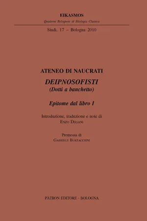 Con questo volume - tre anni dopo l'uscita del prezioso Ipponatte - onoriamo l'impegno di pubblicare l'ultimo inedito di Enzo Degani: la traduzione del I libro dei Deipnosofisti di Ateneo (Epitome), corredata di una sintetica Introduzione di carattere generale ed essenziali note di commento. Il lavoro faceva parte di un ambizioso programma, che - abortito per diverse ragioni nel disegno originario - approdò poi, con altri curatori, alla realizzazione del voluminoso Ateneo integrale dell'Editrice Salerno (I-IV, Roma 2001). Si è optato per la pubblicazione a fronte del testo del Kaibell, giacché è su di esso che si fondava il progetto. Allo scritto mancò una revisione finale da parte del traduttore, che si prefiggeva una resa fluida ed accattivante, anche al fine di ammorbidire l'impatto del lettore con le poche asperità del testo epitomato. Non v'è alcun dubbio che egli, con l'acribia che lo contraddistingueva, avrebbe continuato a rimeditare e a rifinire con indefesso labor limae ogni dettaglio della versione e delle note. È stato sostanzialmente rispettato il dettato originario, apportando soltanto minimi interventi di carattere redazionale.